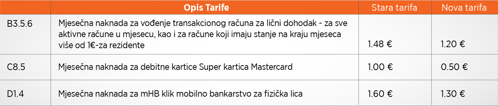 Naime, mjesečna naknada za vođenje transakcionog računa za lični dohodak za rezidente, naknada za debitnu Mastercard Super Karticu, kao i naknada za mHB klik mobilno bankarstvo za fizička lica ostaju nepromijenjene, odnosno neće se povećavati.